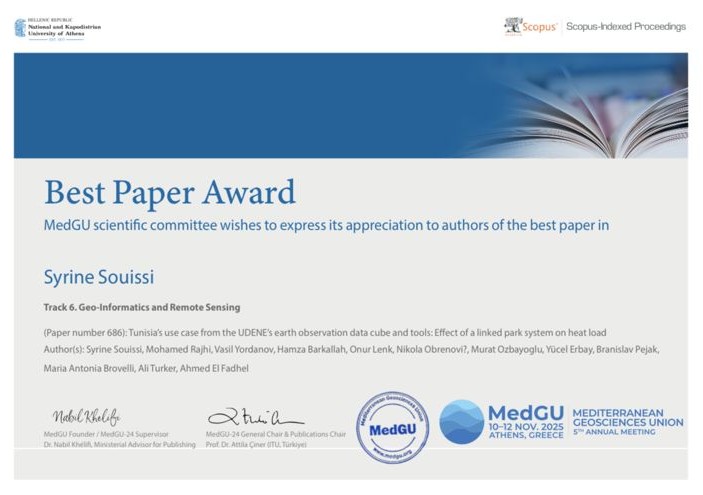 Syrine Souissi was awarded the Best Paper Award at the Mediterranean Geoscience Union Annual Meeting (MedGU-25), held in Athens, Greece, from 10 to 12 November 2025. This recognition was granted by the MedGU-25 Scientific Committee and the paper was published in the conference proceedings by Springer (Scopus indexed).